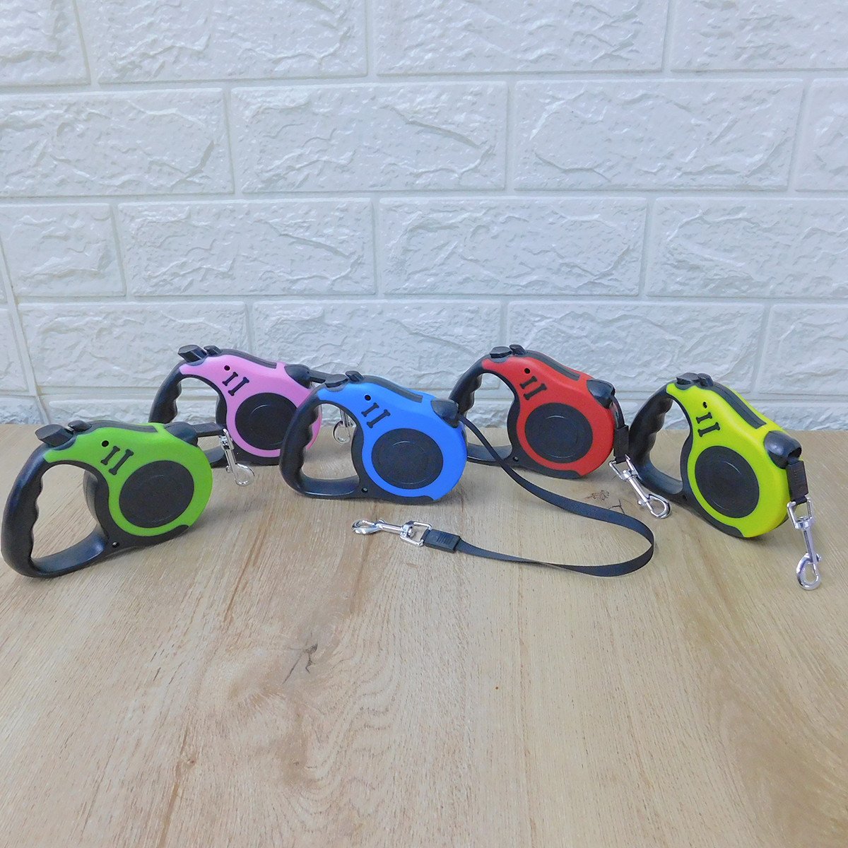 -Estira la correa hasta donde desees y presiona suavemente el botón grande, dejar presionado y soltar para que la correa se recoja automáticamente.